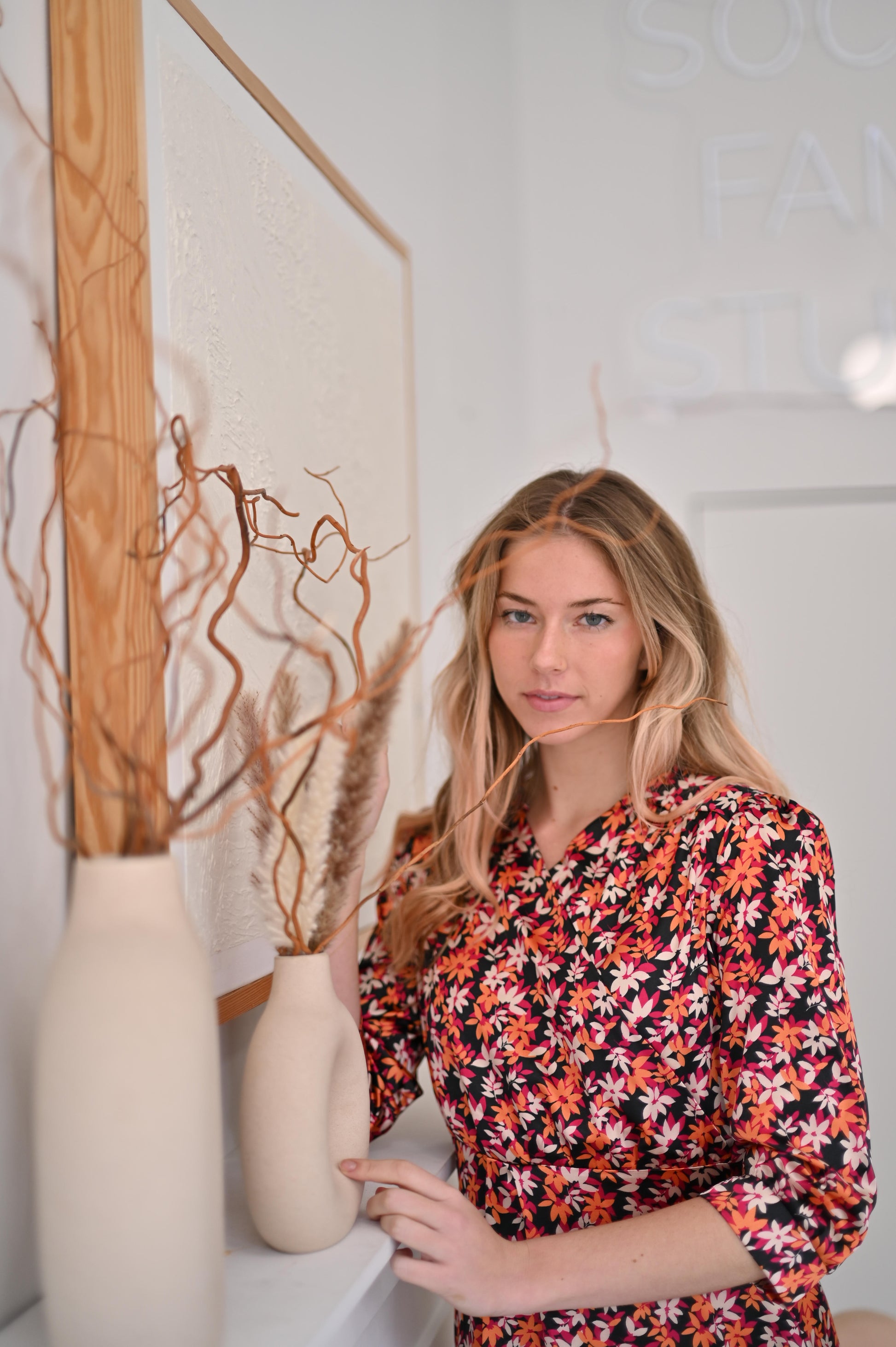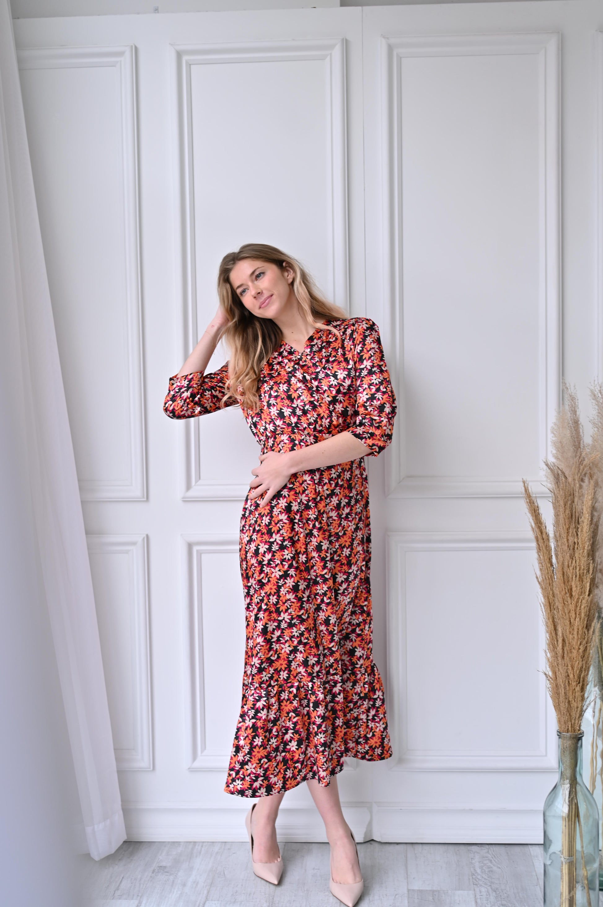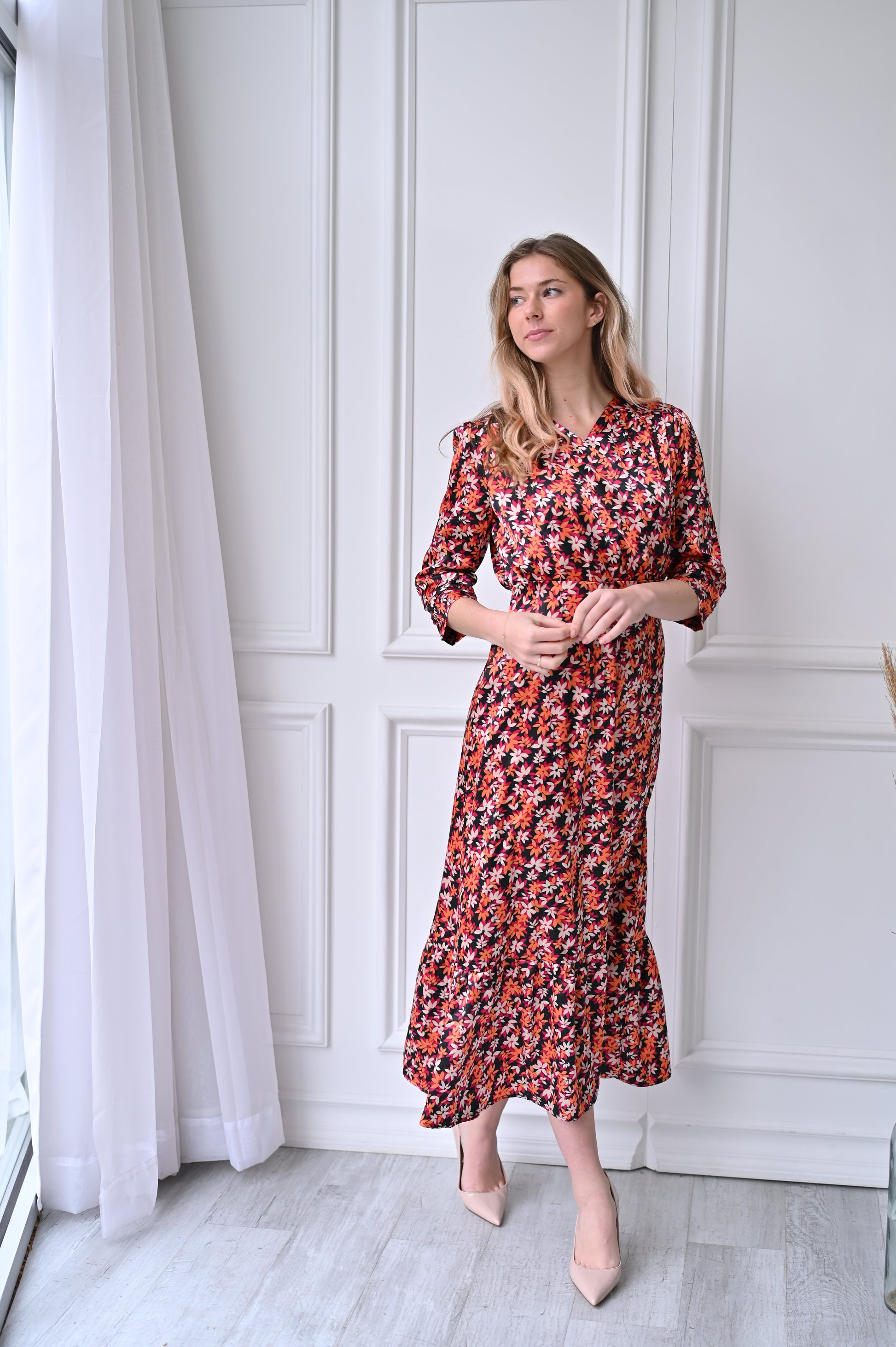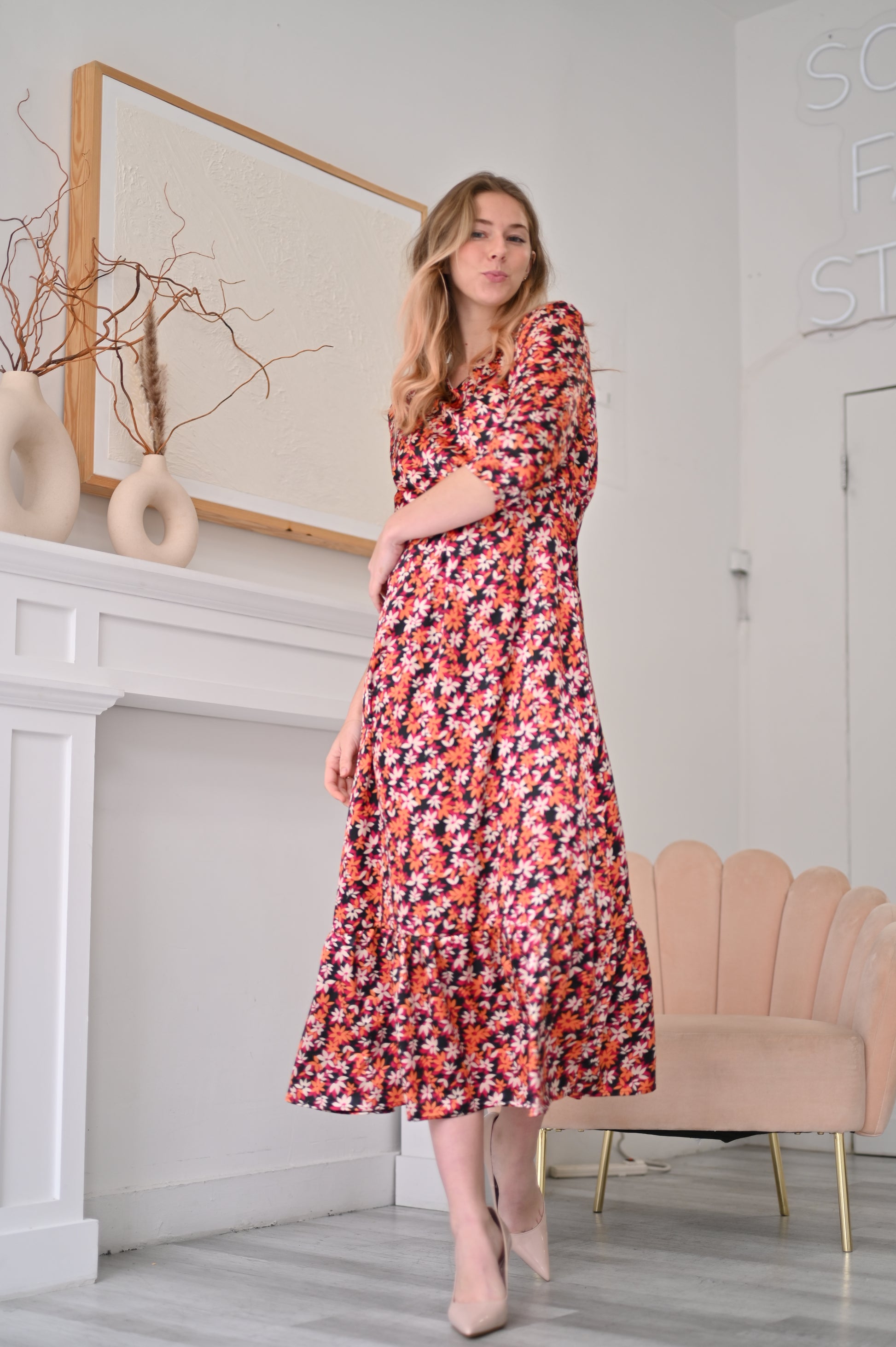 Effortlessly elegant, the Nova dress is the perfect blend of comfort and sophistication. Featuring a vivid red and pink blossom print against a black base, it captures a bold yet feminine essence. The dress is tailored with a flattering faux wrap front and a subtly cinched waist for a graceful silhouette. Finished with 3/4 length sleeves and a softly flared hem, it’s ideal for both everyday outings and dressed-up occasions.